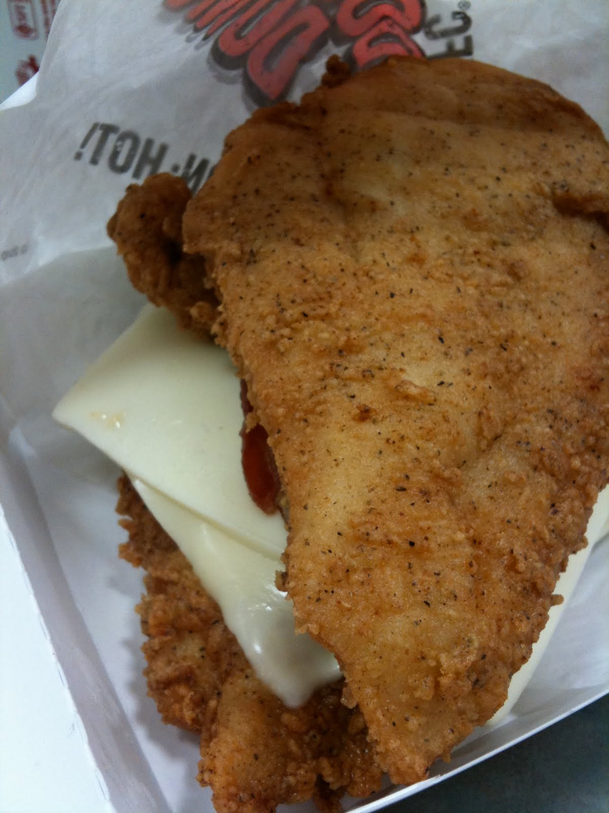 The sandwich. Our group wound up ordering 5 DD's. The first two were made with chicken that had already been cooked, which explains why the cheese isn't melted. The other three were made with chicken they cooked when we ordered. Honestly, I almost wish I'd gotten the "older" chicken, because mine was too hot to hold.